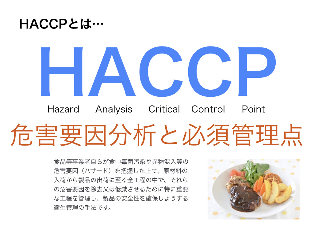 | Hazard Analysis and Critical Control Pointの略で、危害要因を分析して(Hazard Analysis )必修管理点(Critical Control Point)を決めて管理する衛生管理の手法です。 |