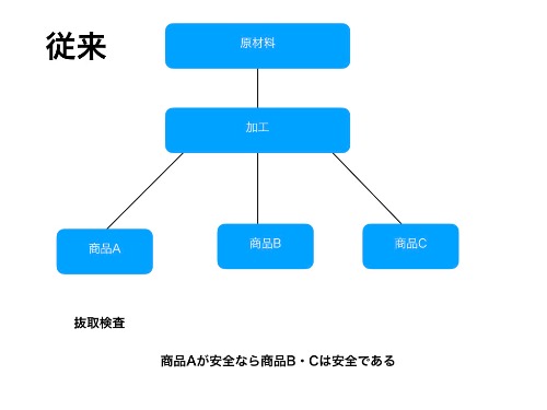 | 従来は、最終製品のサンプリング検査で安全なら安全と確認してますが。HACCPでは、工程ごとに安全を確認することで、最終製品のすべてが安全であると確認することができます。 | |